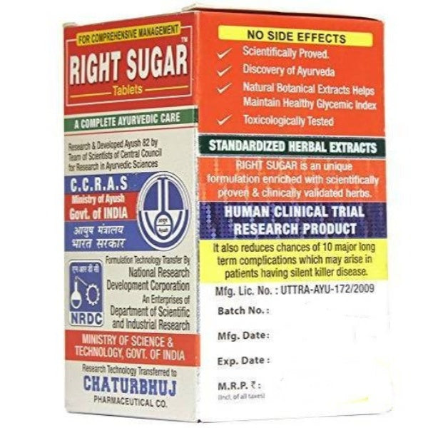 Chaturbhuj Pharmaceutical Right Sugar Tablets : 120 Tab Item Weight : 130 g Package Dimensions : 10.8 x 5.6 x 5.6 cm About this product: No Side E...