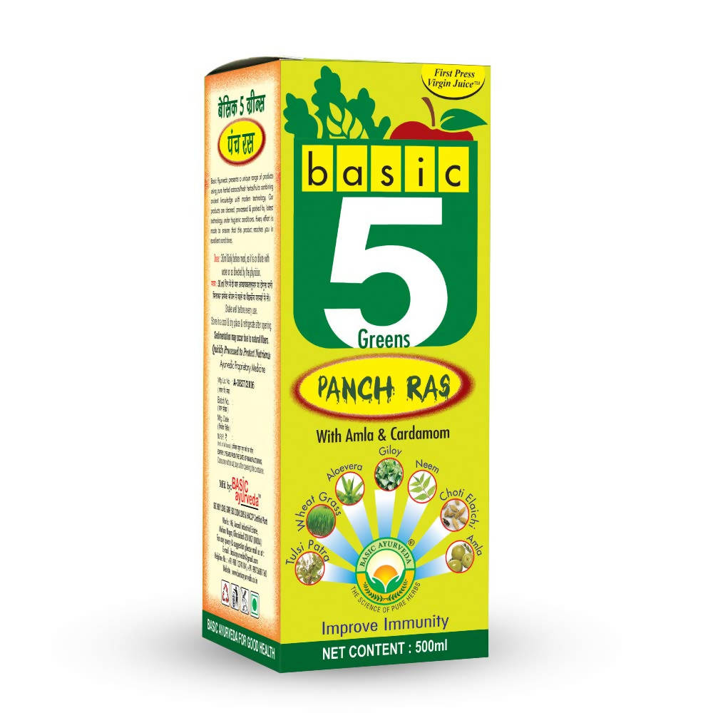 • Basic Ayurveda Basic Five Greens Panch Ras is a combination of fresh green leaves such as Berries, Bitter Gound, Aloe vera leaves, Triphala, Boerhavia diffusa Leaves.