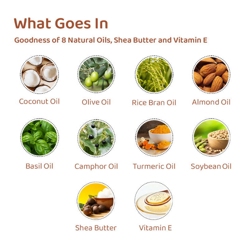 • Cocus Nucifera(Coconut) oil, Oryaza Sativa (Rice) Bran Oil, Hydrogenated Soybean Oil, Olea Europea(Olive) oil, Butyrospermum Parkii (Shea Butter), Olea Europea wax, Glyceryl Caprylate, Glyceryl Undecylenate, Prunus Amygdalus Dulas (Sweet Almond) Oil, Fragrance, Vitamin E, Ocimum Basilicum (Basil) Oil, Cinnamomum camphora (Camphor) Bark Oil, Curcuma Longa (Turmeric) Root Oil