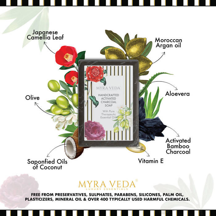 Myra Veda Handcrafted Activated Charcoal SoapIngredients:Coconut Oil, Olive OilDirections For Use:Wet your face and body with warm and apply soap g...
