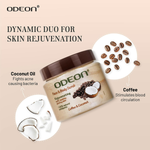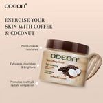 Odeon Coffee & Coconut Scrub is designed for gentle exfoliation of both the face and body. It is crafted with coffee, coconut oil, and finely ground walnut shell powder, offering a textured blend that helps in removing surface impurities. The product has a rich, aromatic coffee scent complemented by the natural essence of coconut.