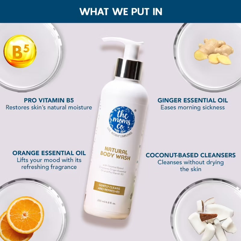 Our Natural Body Wash is a toxin-free combination of coconut-based mild cleansers and natural moisturizers that help your skin restore its natural balance and essential oils that help with morning sickness and give your spirits a lift.