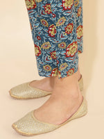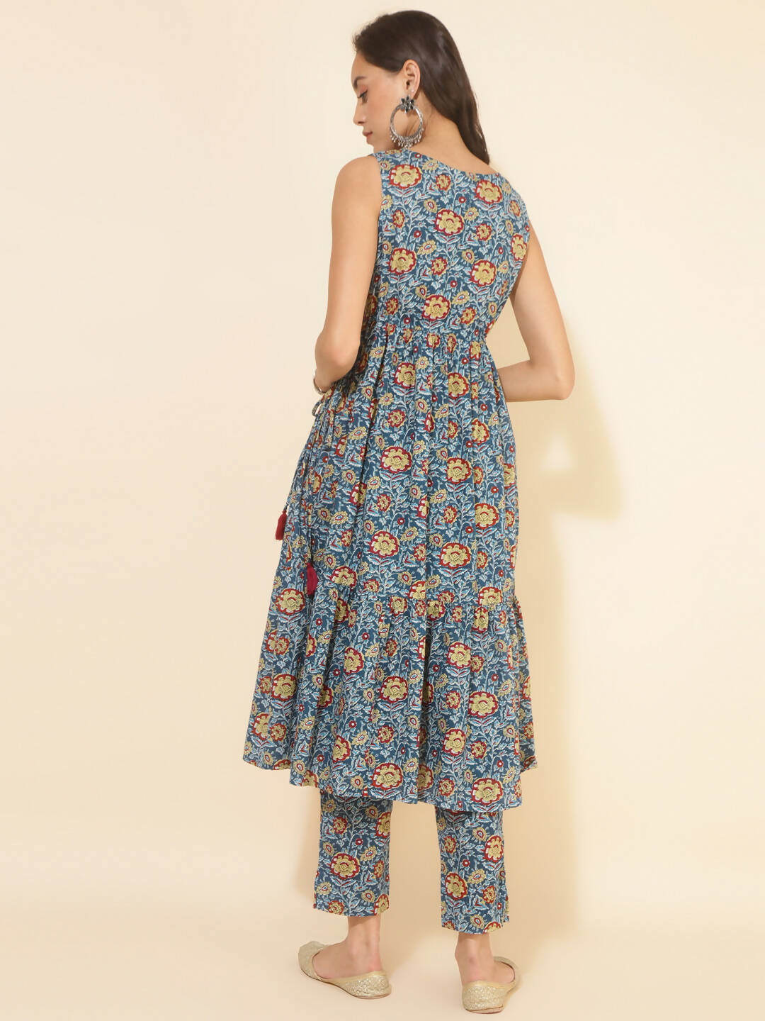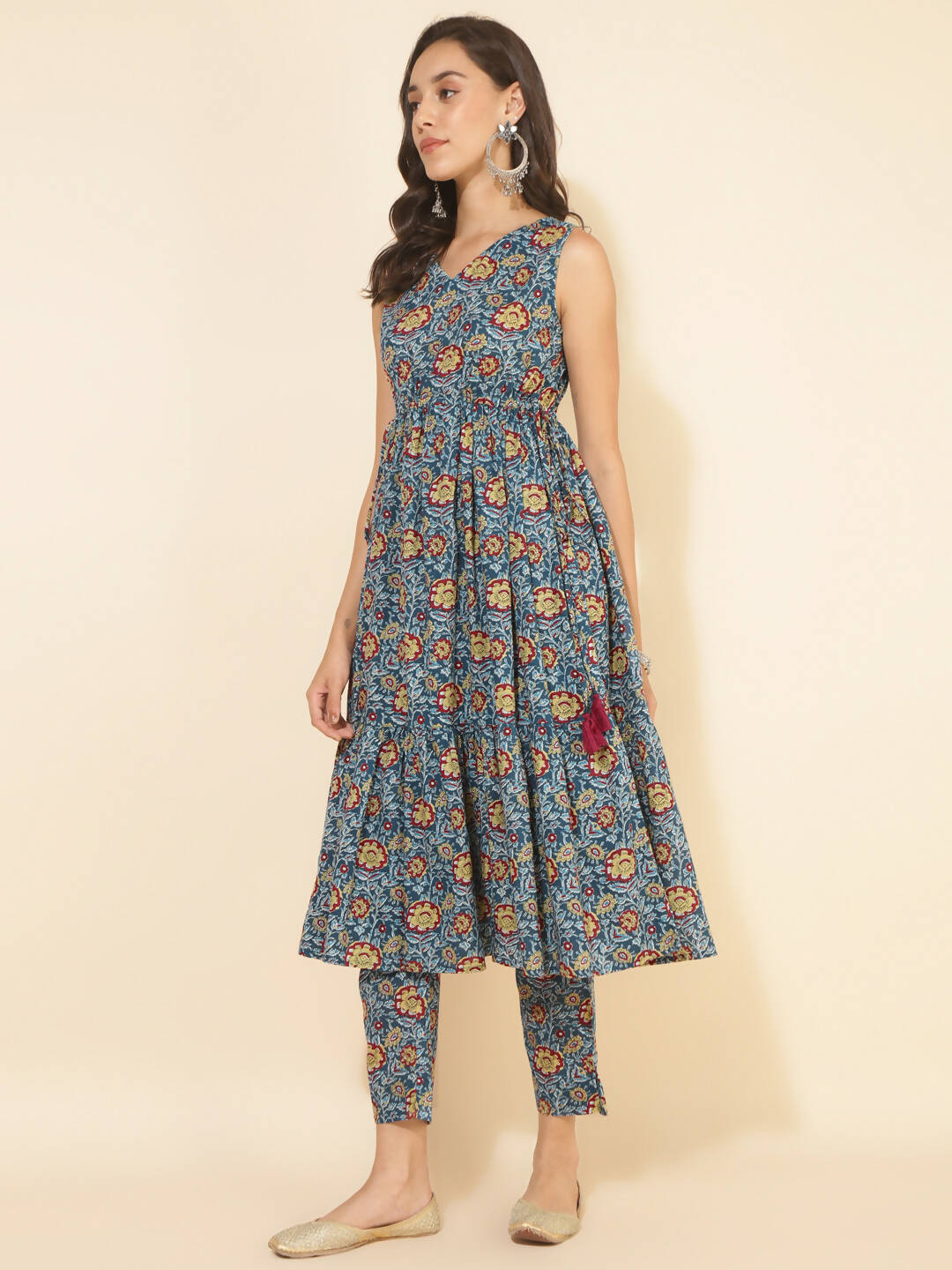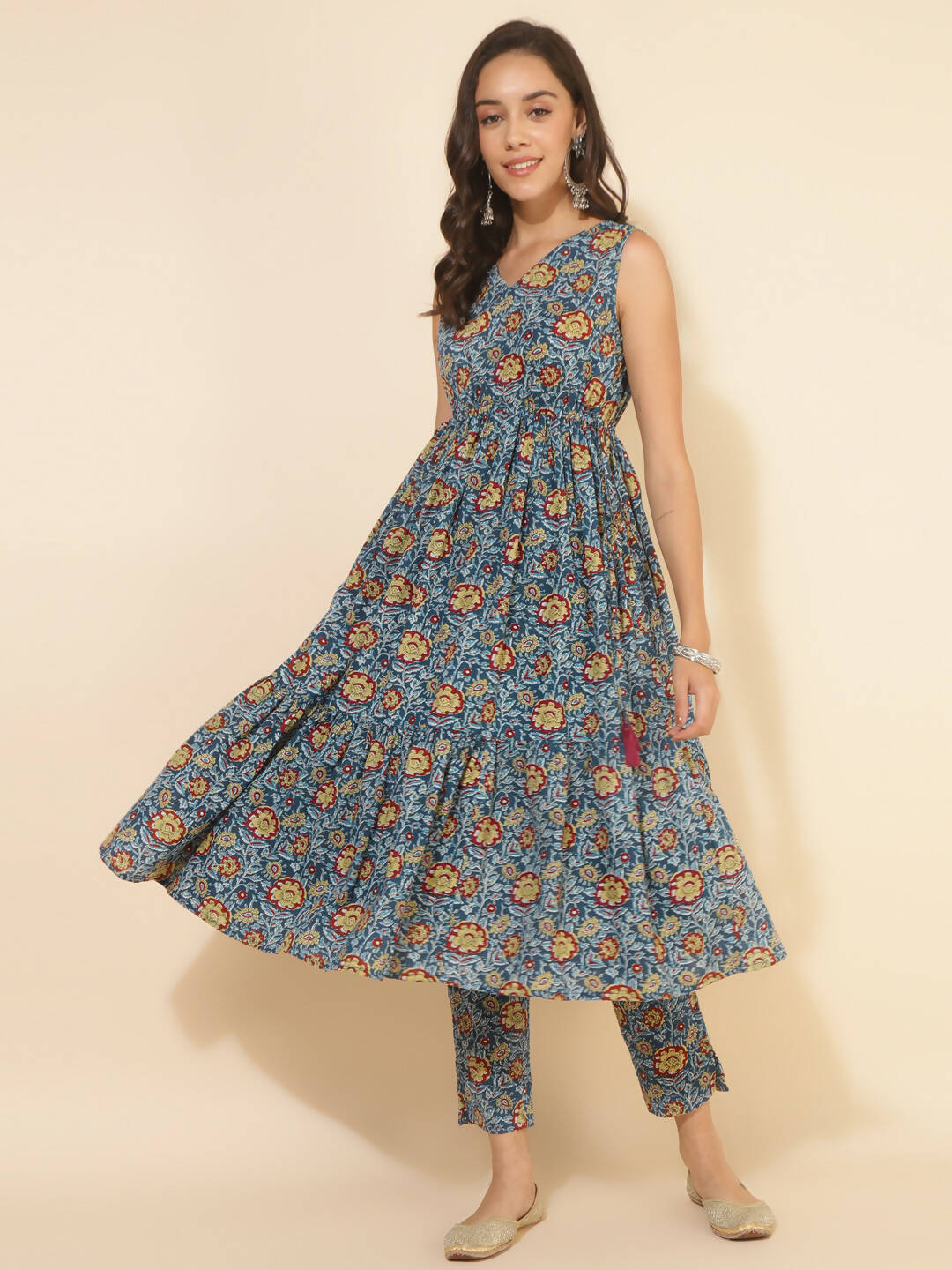Janasya Women's Blue Cotton Floral Printed Casual Flared Kurta Set - Distacart