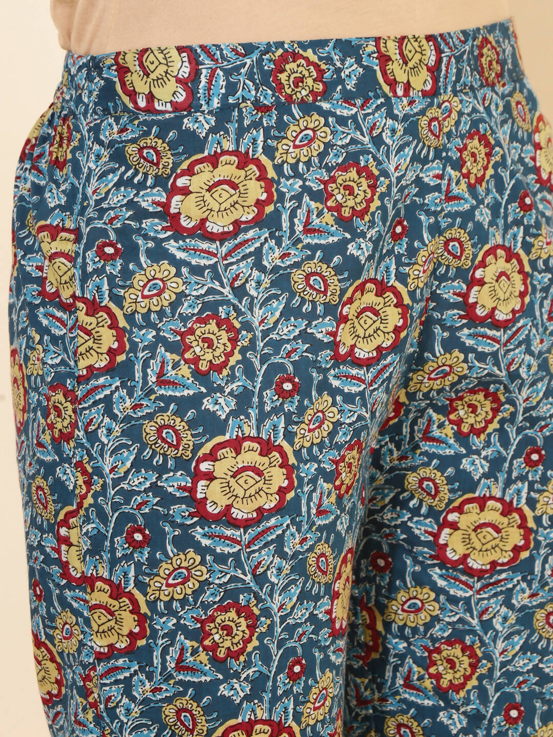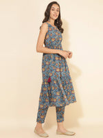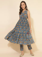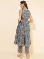 Janasya Women's Blue Cotton Floral Printed Casual Flared Kurta Set