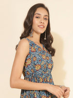 Janasya Women's Blue Cotton Floral Printed Casual Flared Kurta Set - XL