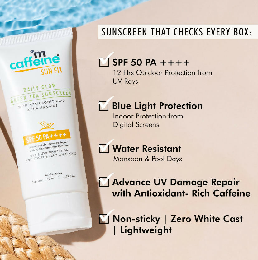 mCaffeine Sun Fix Daily Glow Green Tea Sunscreen SPF 50 PA++++ with Niacinamide, Lightweight & No White CastAbout the Product:Get 12 hours UV p...