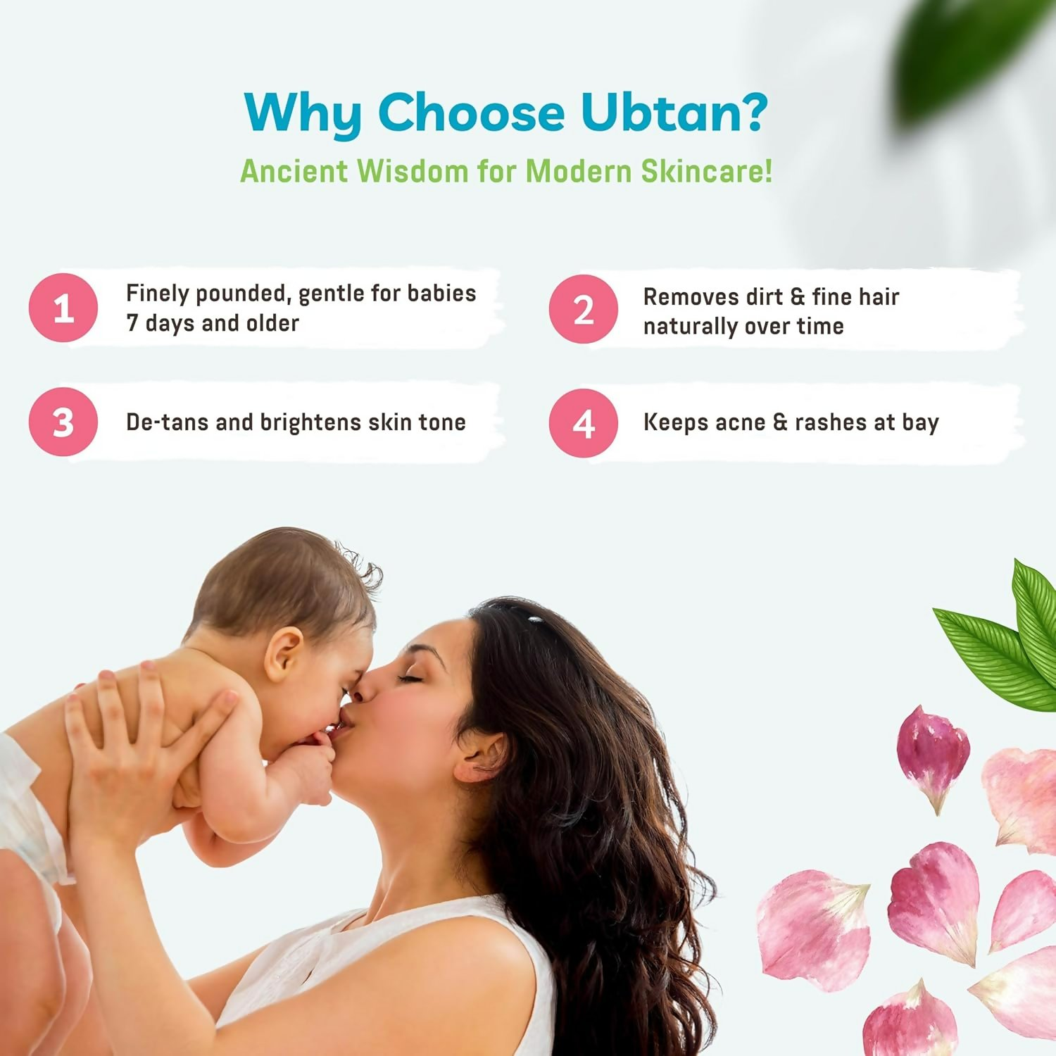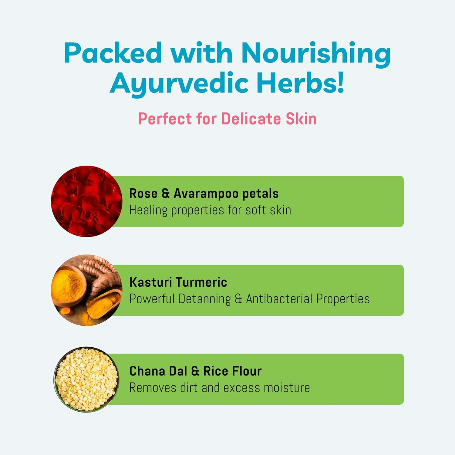 • Traditional Baby Bath Powder with green gram, channa dal, rice flour, kasturi turmeric, rose petals and avarampoo petals. Edible ingredients for gentle baby skincare