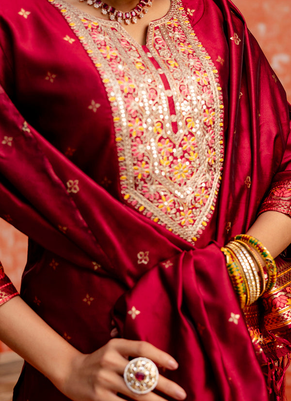 This red salwar suit in a cotton silk blend offers lightweight comfort with a rich texture. Embroidery work lends it a touch of refinement, making it ideal for casual wear with a festive vibe. Easy to carry and stylish for everyday elegance.