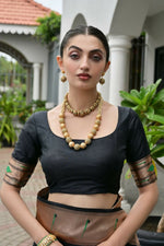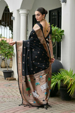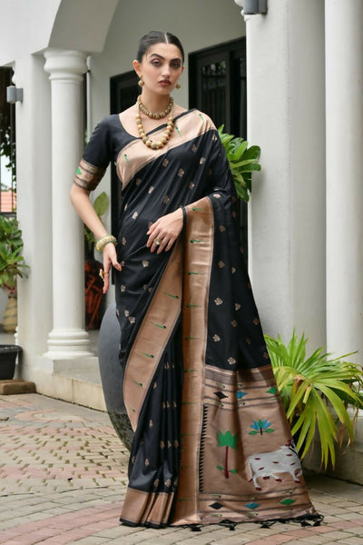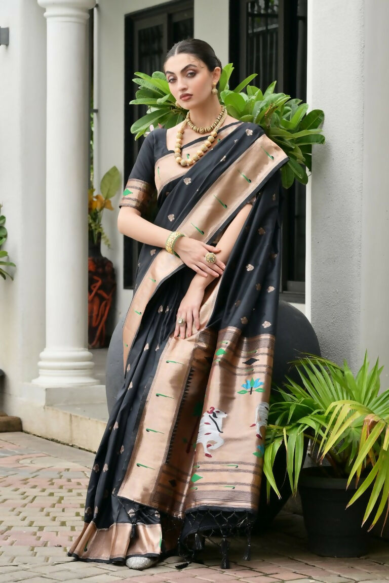 Vishnu Weaves Women's Black Paithani Silk Zari Woven Saree with Blouse