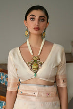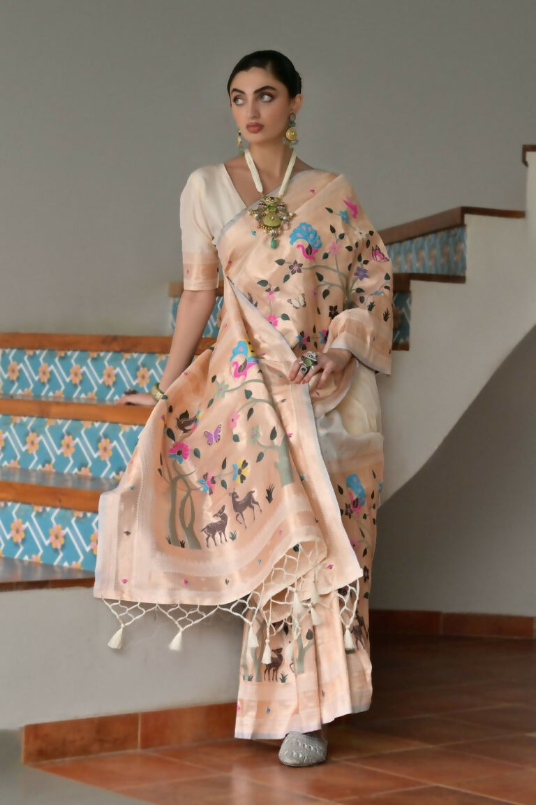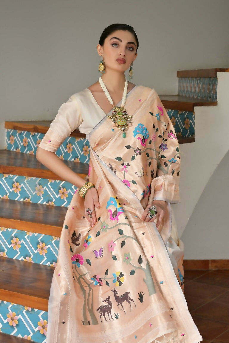 Vishnu Weaves Women's Cream Paithani Silk Zari Woven Saree with Blouse