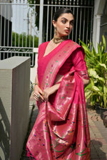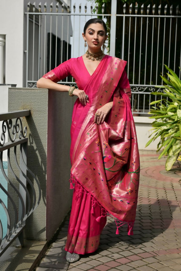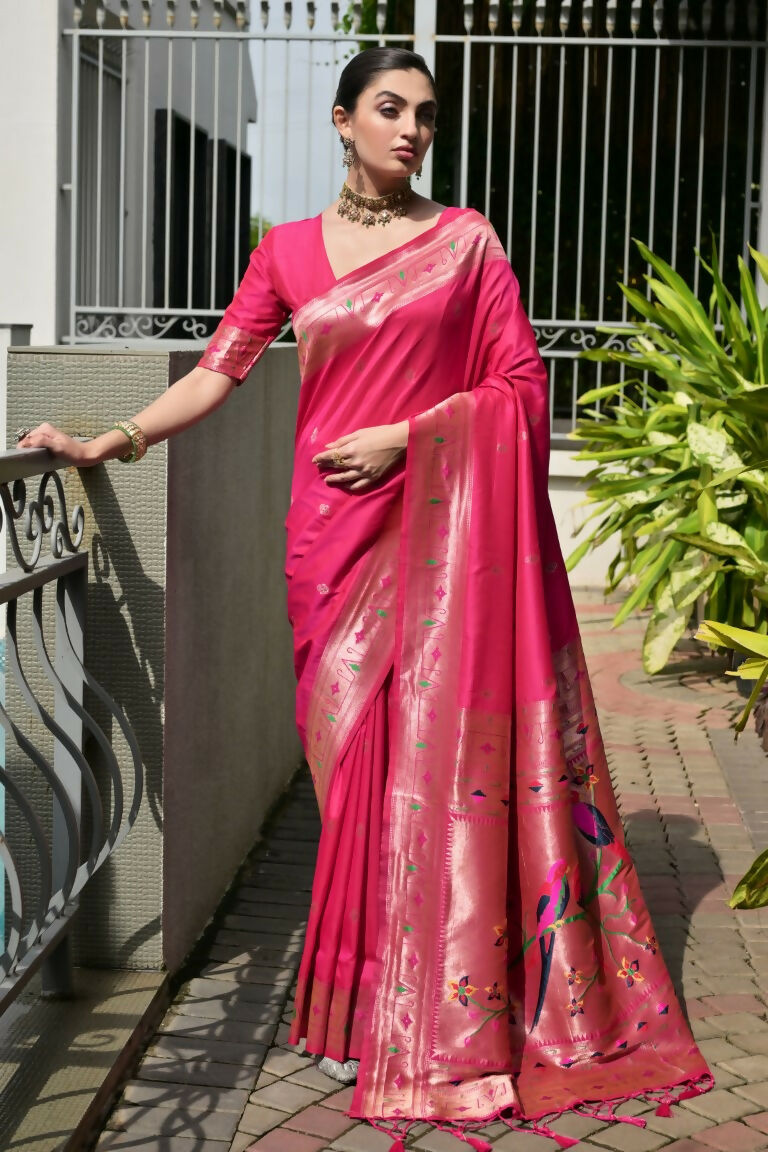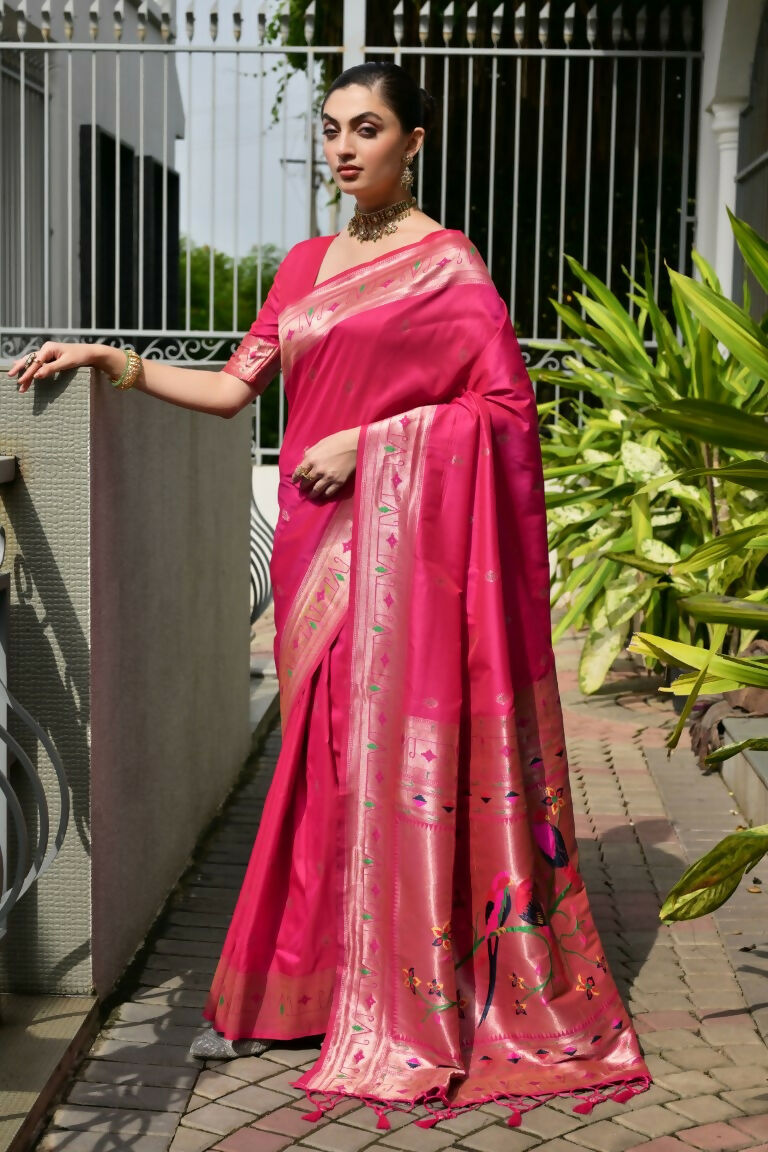 Vishnu Weaves Women's Pink Paithani Silk Zari Woven Saree with Blouse