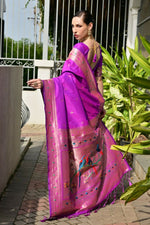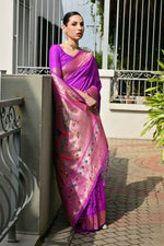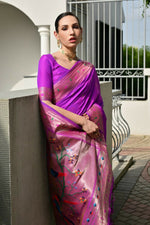 Vishnu Weaves Women's Purple Paithani Silk Zari Woven Saree with Blouse
