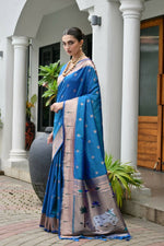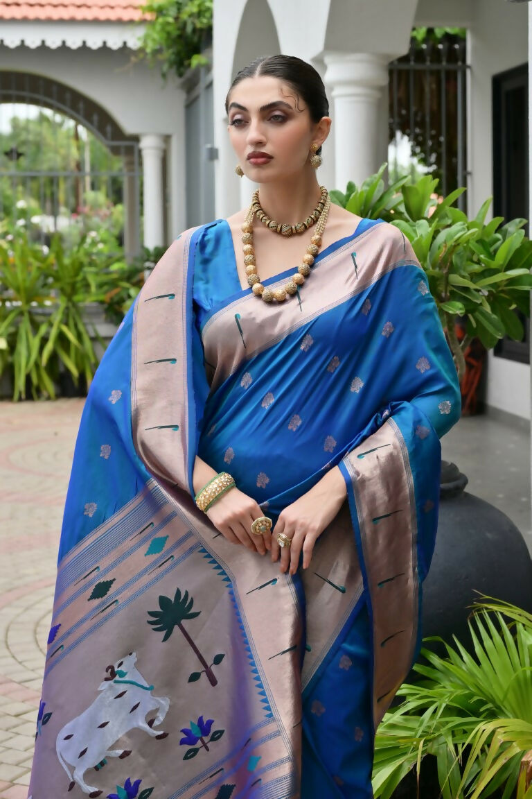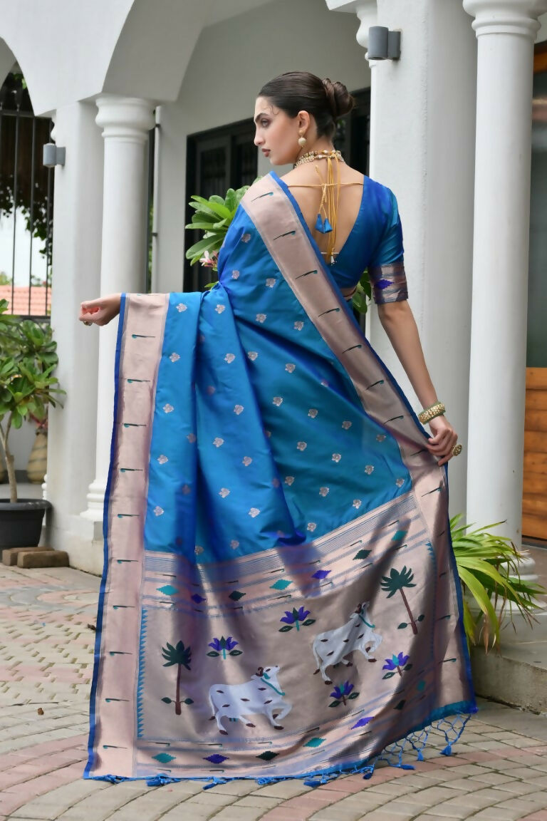 Vishnu Weaves Women's Rama Paithani Silk Zari Woven Saree with Blouse Color: Rama Material: Paithani Silk Legal Disclaimer:  Product color may sl...