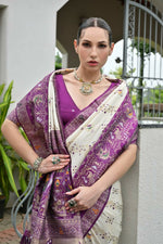 Vishnu Weaves Women's Wine Banarasi Silk Patola Zari Woven Saree with Blouse