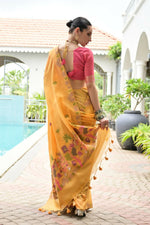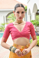 Vishnu Weaves Women's Yellow Muga Cotton Thread Weaving Saree with Blouse