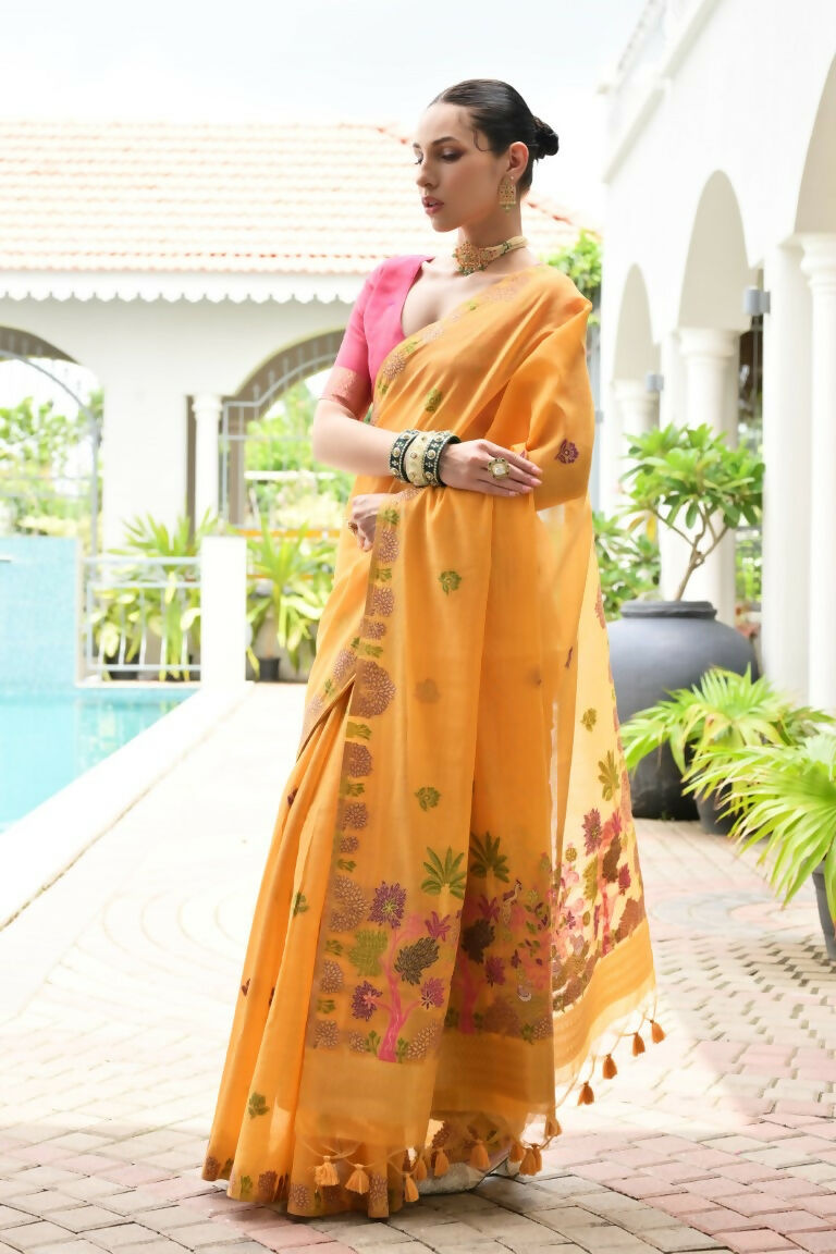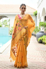 Vishnu Weaves Women's Yellow Muga Cotton Thread Weaving Saree with Blouse Color: Yellow Material: Muga Cotton Legal Disclaimer:  Product color ma...