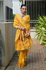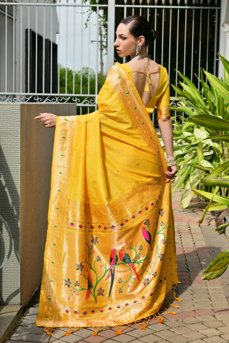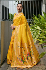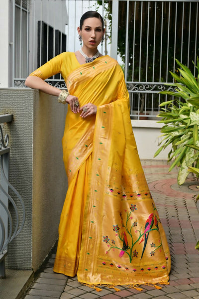 Vishnu Weaves Women's Yellow Paithani Silk Zari Woven Saree with Blouse