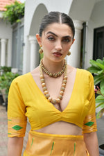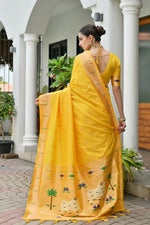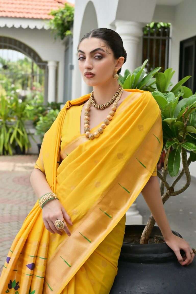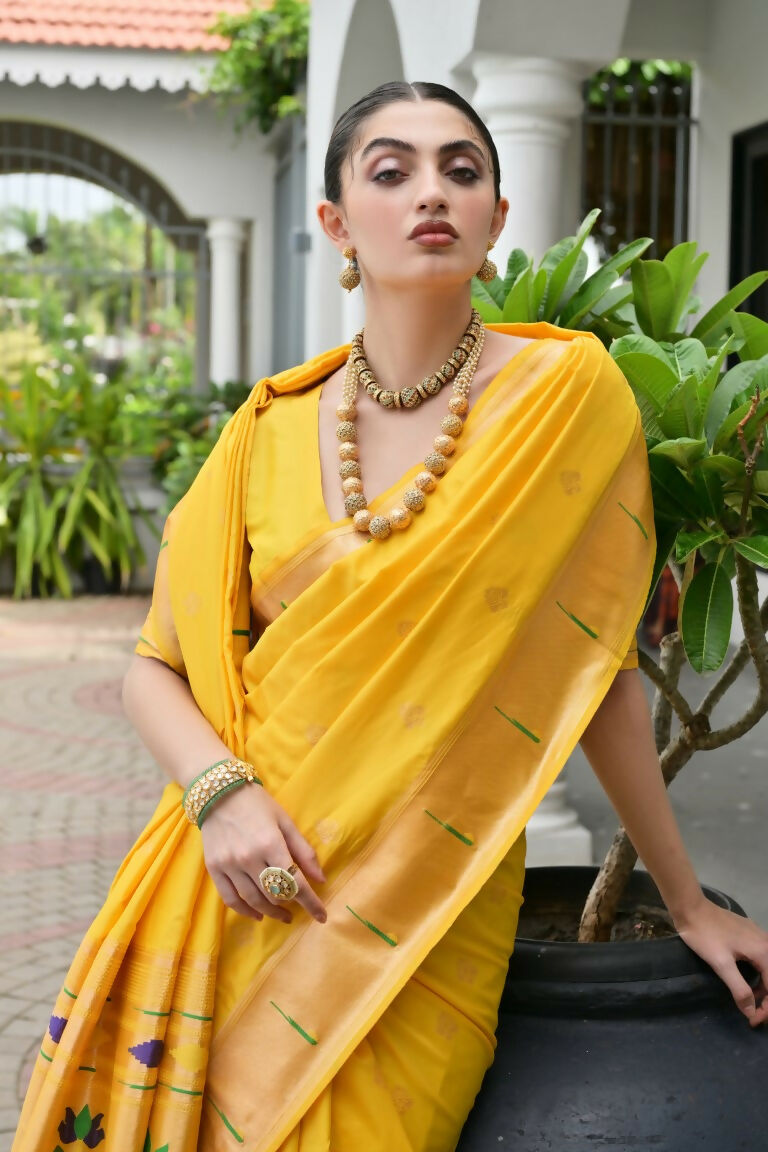 Vishnu Weaves Women's Yellow Paithani Silk Zari Woven Saree with Blouse