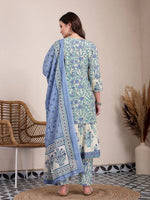 Yufta Blue And Beige Pure Cotton Floral Print Tiered Kurta Dupatta Set