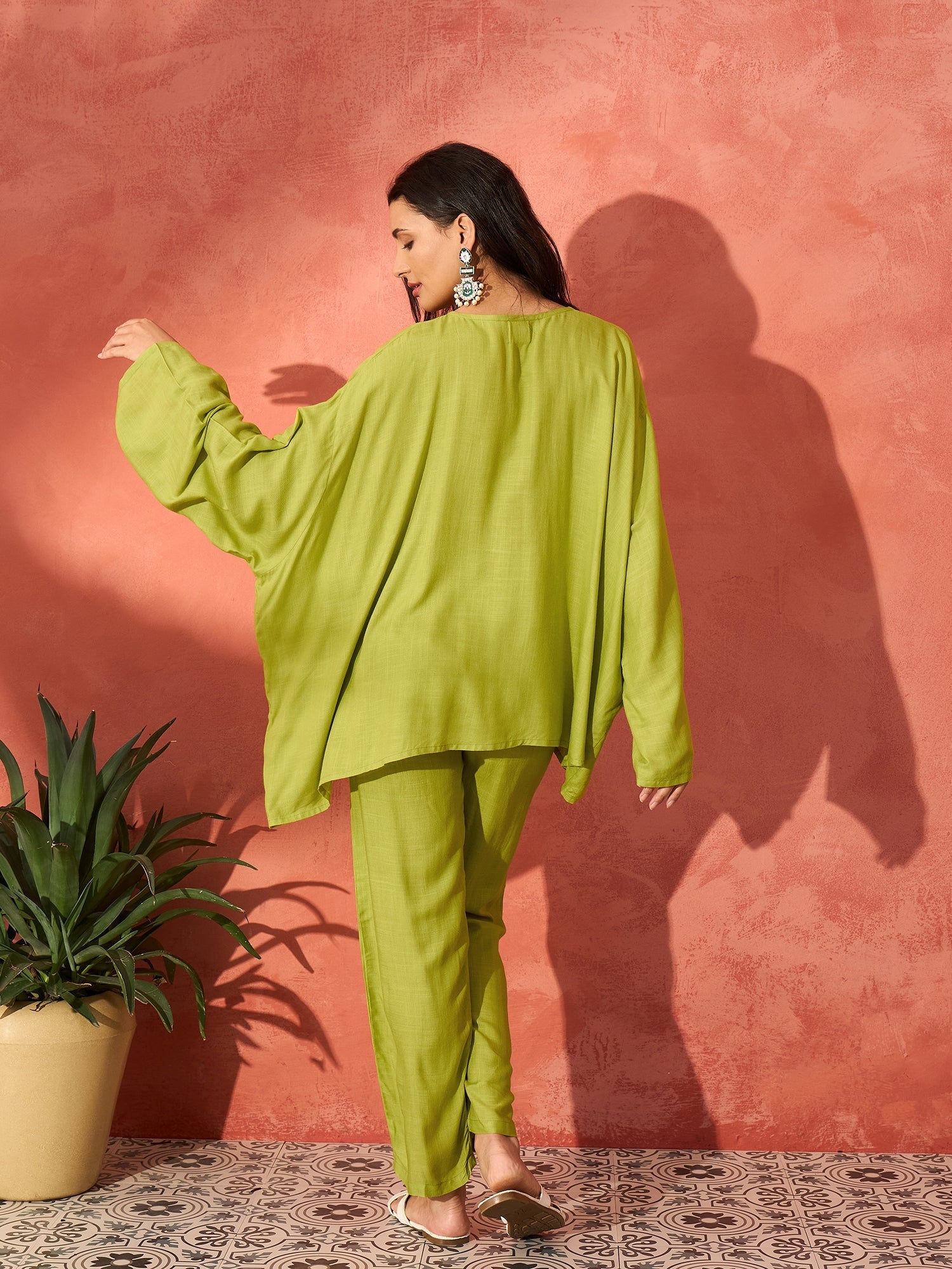 The Pear Green Solid Boho Full Sleeve Co'ord Set is a chic and versatile outfit that combines the fresh, vibrant shade of pear green with a relaxed bohemian style. Here€™s a detailed description and styling guide for this ensemble: