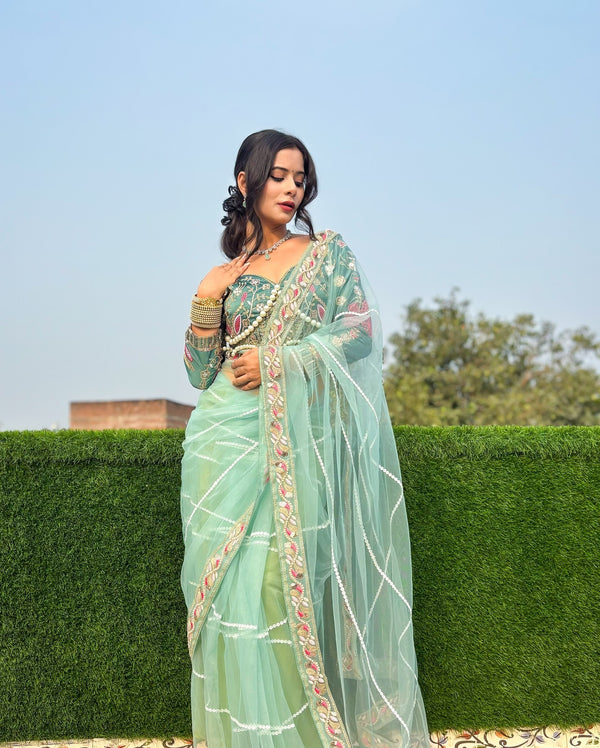 Evanik Pista Net Embroidery work Saree with Moti Hand work Blouse