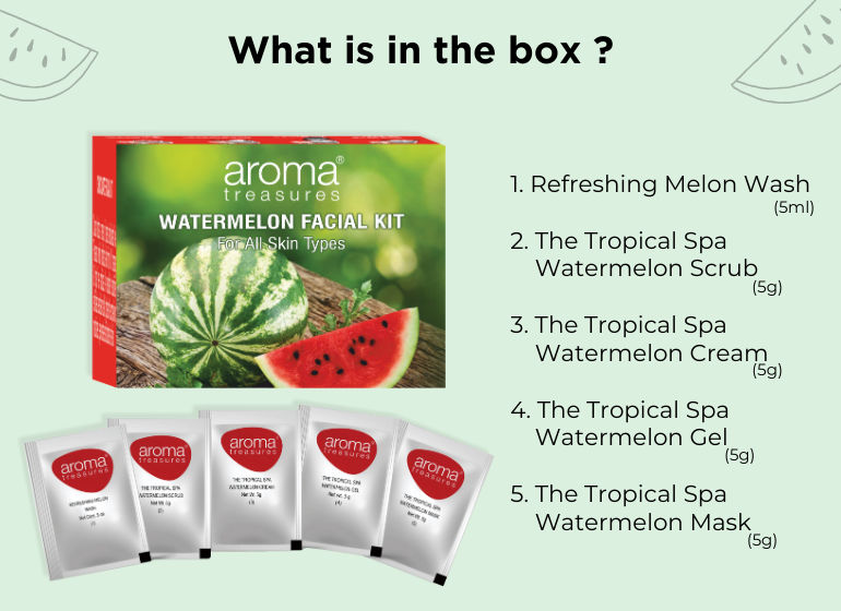 Aroma Treasures Watermelon Facial KitAbout the Product: How to Use: Massage cleansing wash with little water for 5 mins and wipe off. Mas...