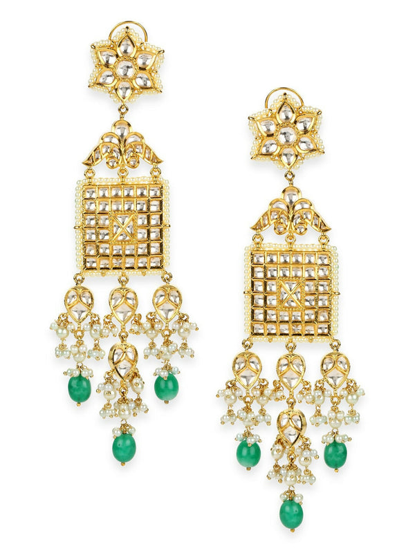 Long Kundan Earrings with Green Stone- Ruby Raang