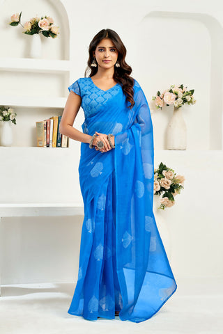 Vastranavya Blue Digital Printed Linen Ready To Wear Designer Saree with Unstitched Blouse