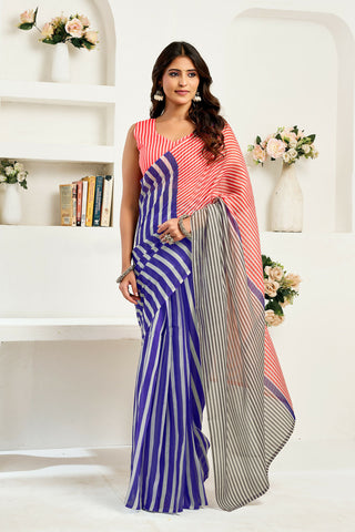 Vastranavya Royal Blue Digital Printed Linen Ready To Wear Designer Saree with Unstitched Blouse