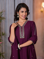 Wine thread embroidered viscose Kurta Pant And Dupatta Set with sequins and zari work. Features a knee-length, straight kurta with a V neckline and three-quarter regular sleeves. Includes solid slip-on pants and an embroidered dupatta for a luxurious, elegant look.