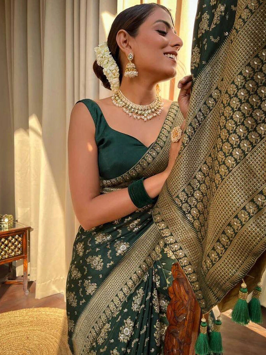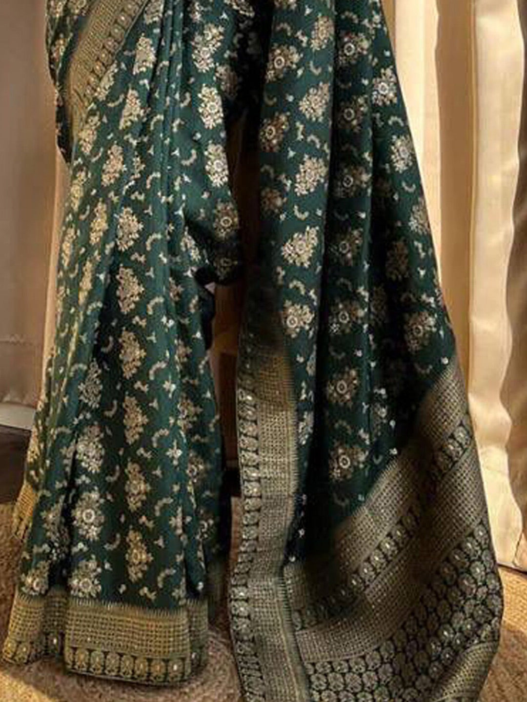 • Green and gold-toned saree