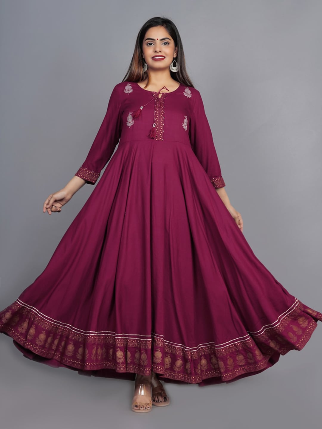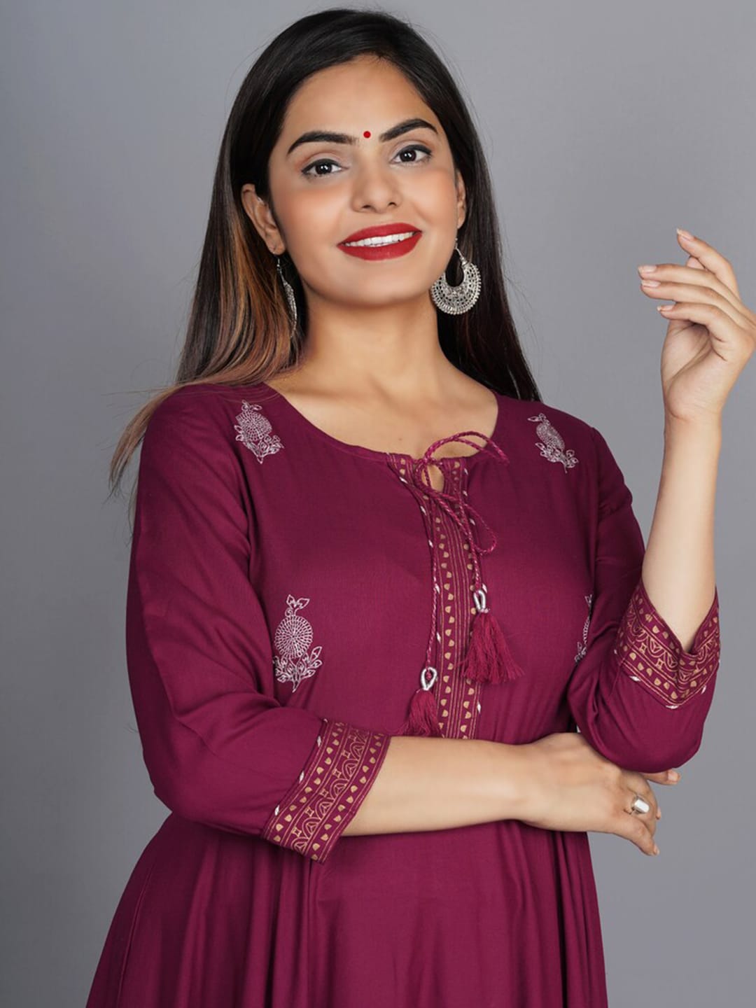 Kalini Women Maroon Floral Embroidered Anarkali Kurta Product Details Colour: maroon Floral embroidered Round neck Long, regular sleeves Anarka...