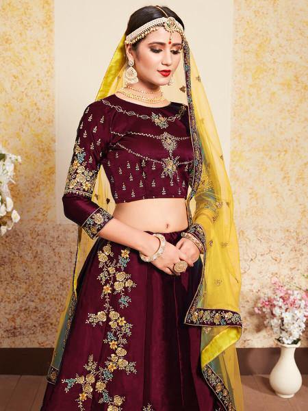 Maroon Satin Embroidered Lehenga features a Pure Satin top and bottom with santoon inner alongside a soft net dupatta. Resham, Swarovski, Zari & Pearl is used for the embroidery of this style.