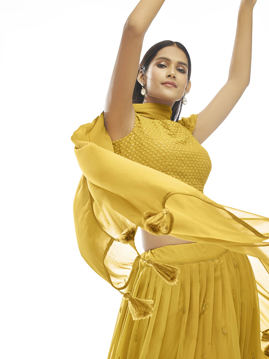Myra Musturd Georgette Embroidered Designer LehengaMusturd Georgette Embroidered Designer Lehenga features a Georgette blouse with micro inner and ...