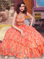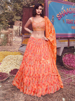 Peach Chinon Embroidered Designer Lehenga features a Chinon blouse with micro inner and Chinon lehenga. Lehenga Work with Thread and Handwork. This Style is made in India and checked by hand to ensure high quality. Only Dry Clean is recommended for Ethinic ethnic wear