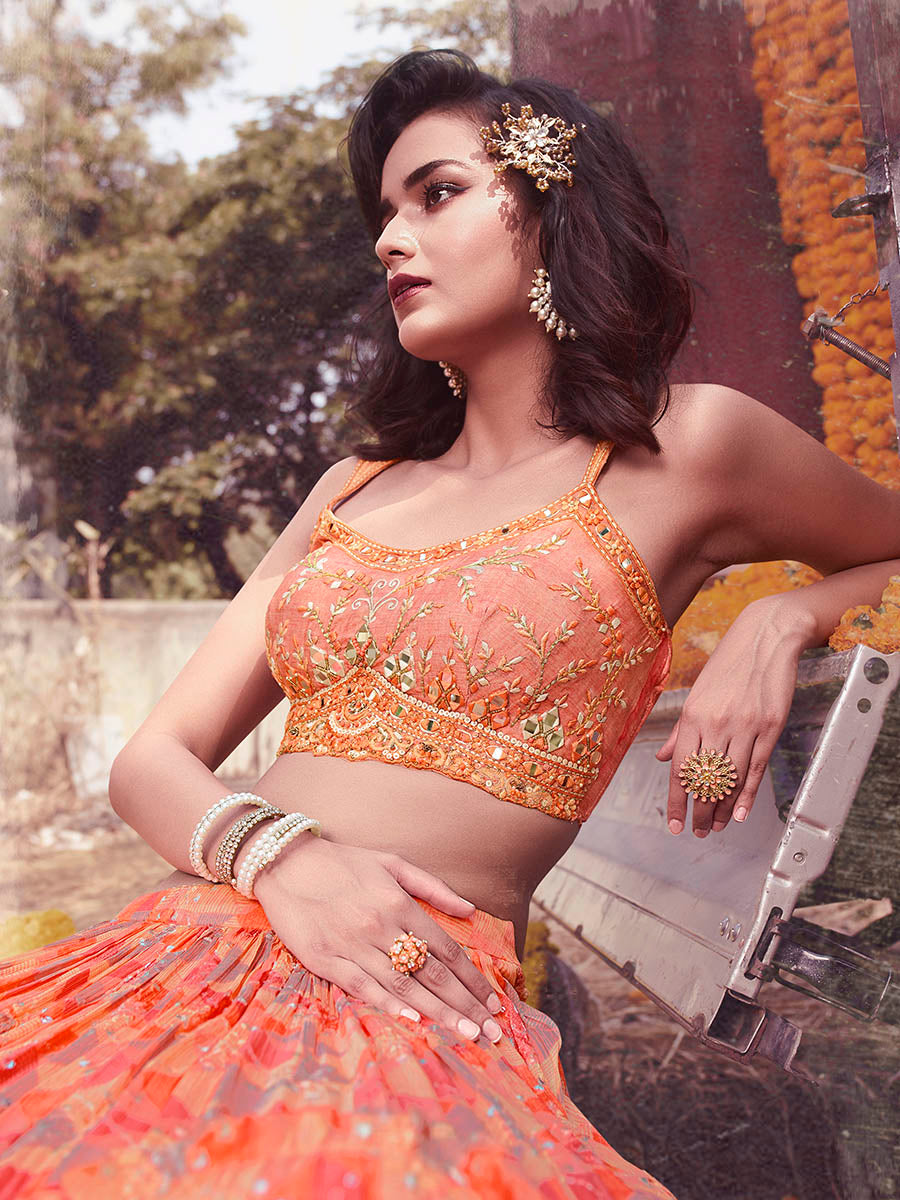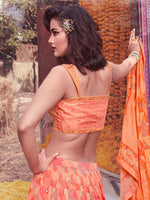 Myra Peach Chinon Embroidered Designer LehengaPeach Chinon Embroidered Designer Lehenga features a Chinon blouse with micro inner and Chinon leheng...