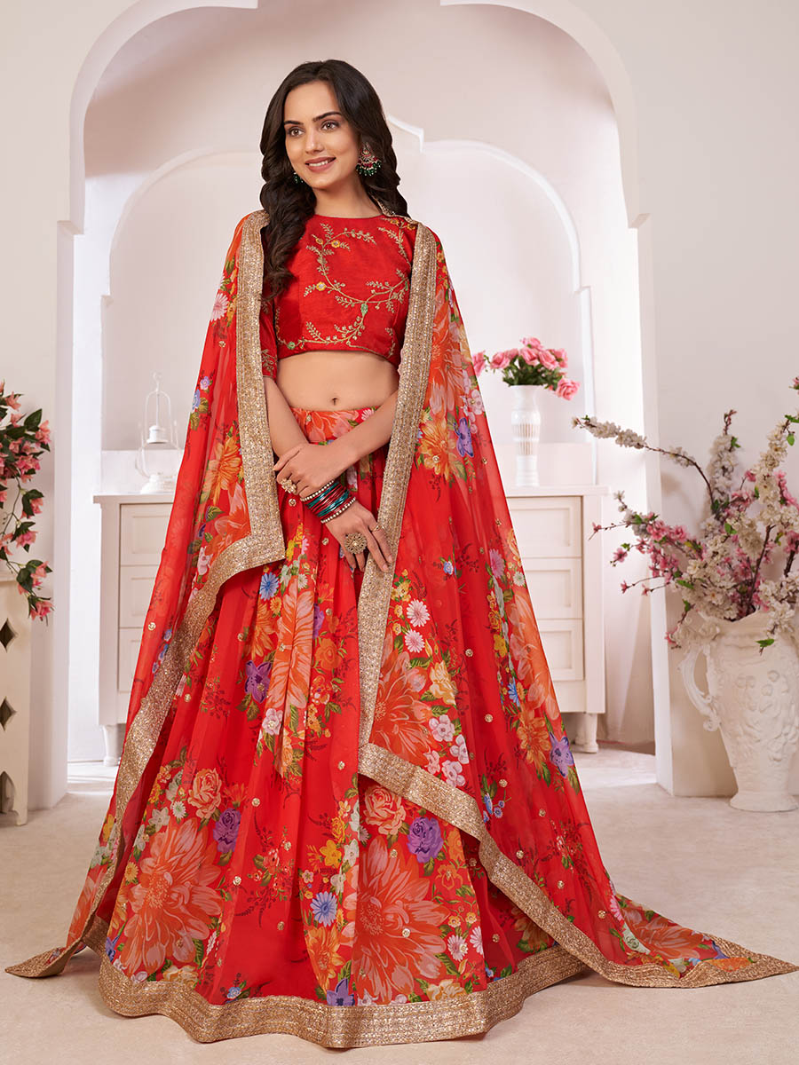 Myra Red Tomato Digital Printed Georgette Lehanga - Distacart