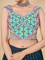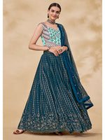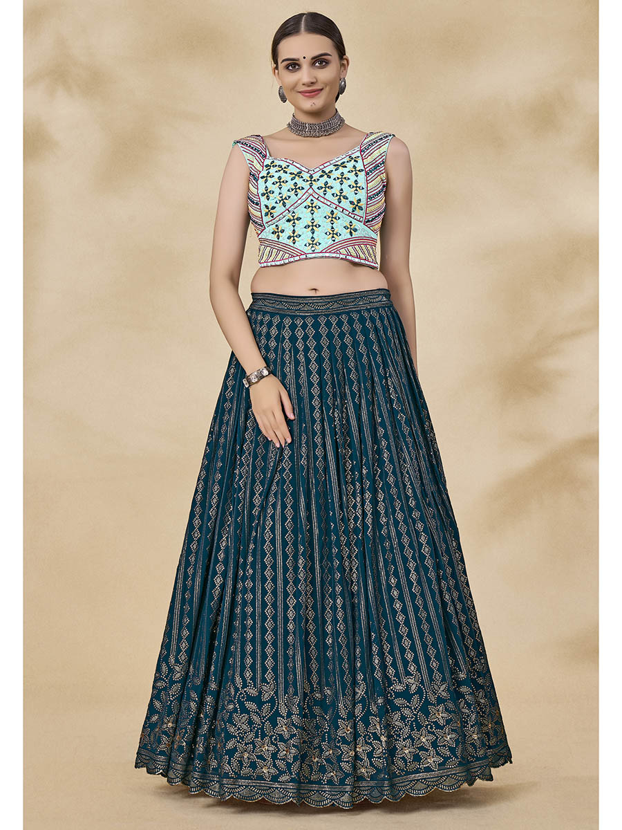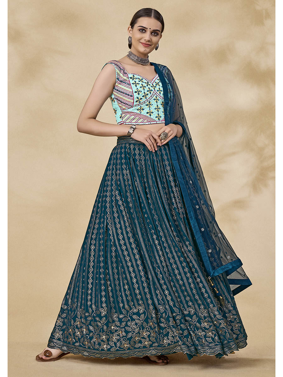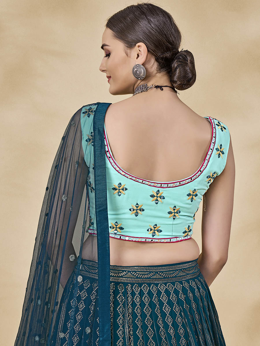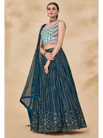 Teal Green Georgette Embroidered Designer Lehenga features a Georgette blouse with micro inner and Georgette lehenga. Work with Mirror & Thread with Sequince Embroidered Work. This Style is made in India and checked by hand to ensure high quality. Only Dry Clean is recommended for Ethinic ethnic wear