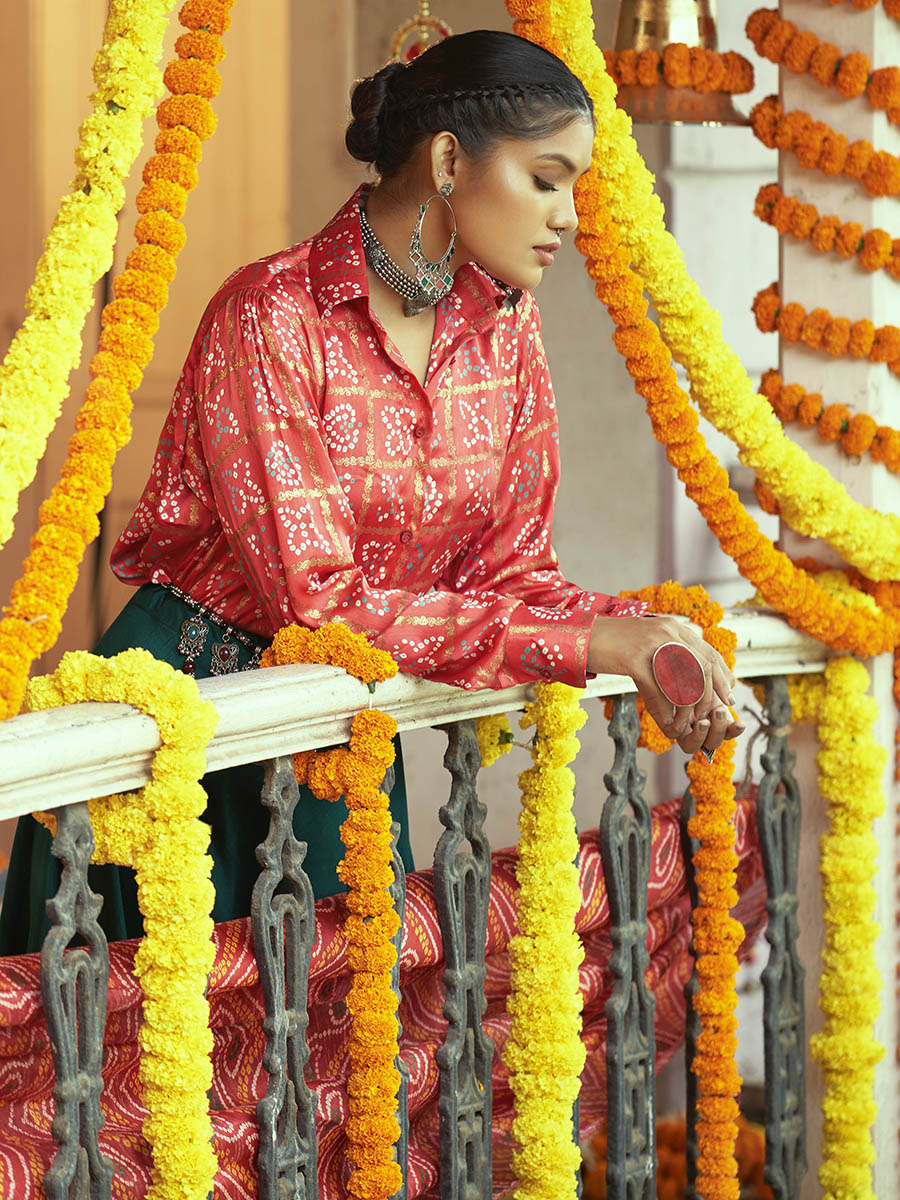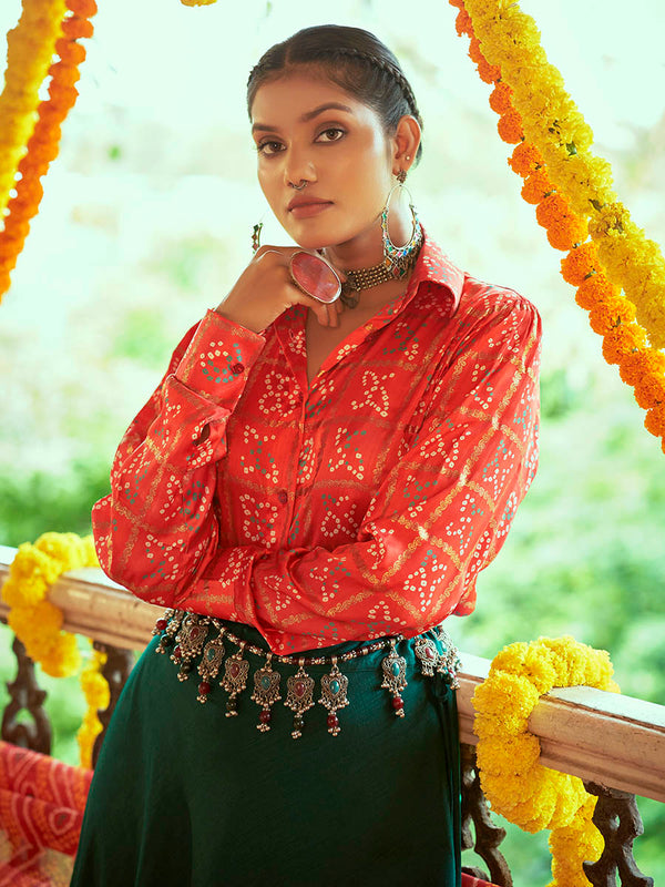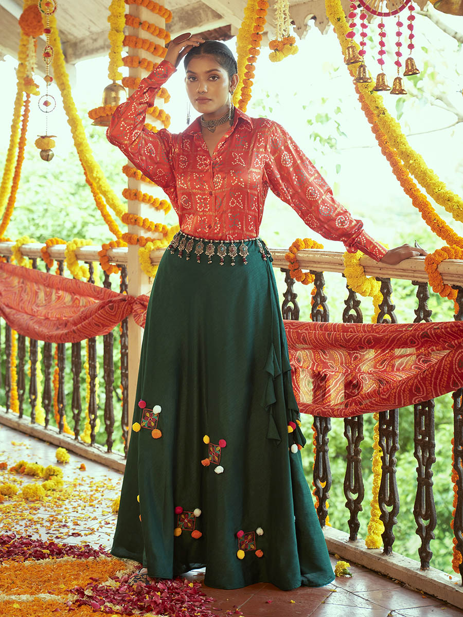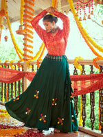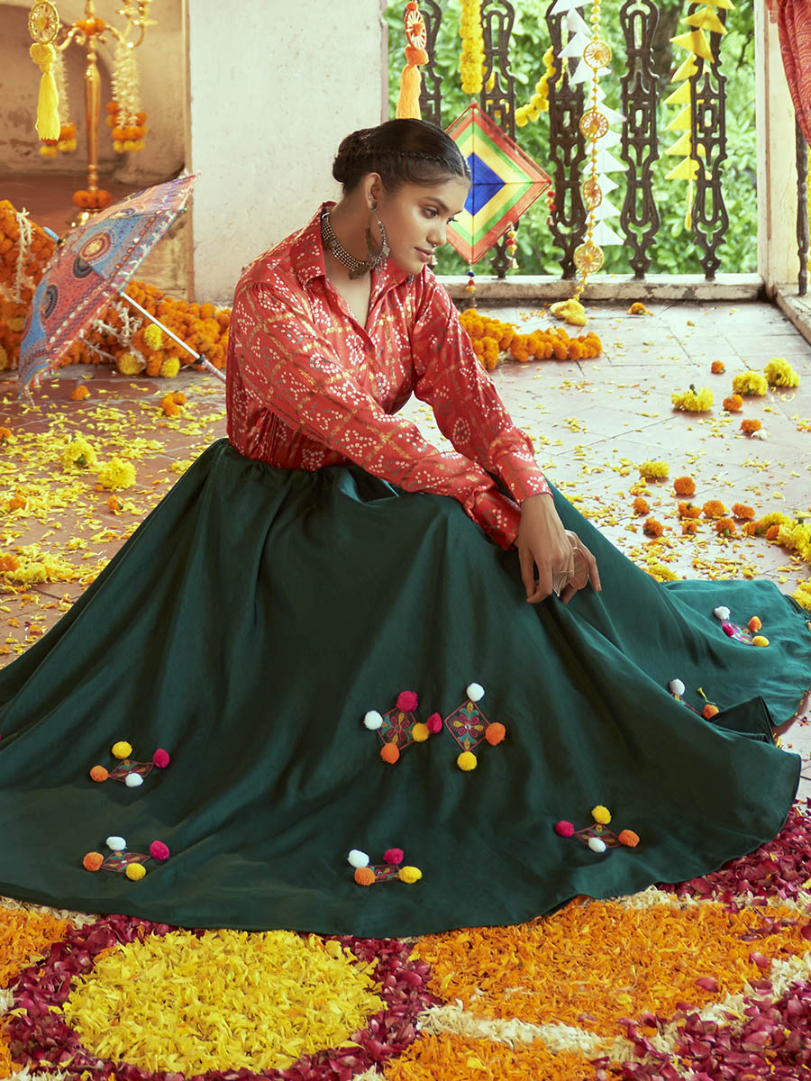 Tomato Red & Green Cotton Embroidered Navratri Special Lehenga features a Cotton lehenga and Gajji Silk choli. Work with Printed and Embroidered work. This Style is made in India and checked by hand to ensure high quality.