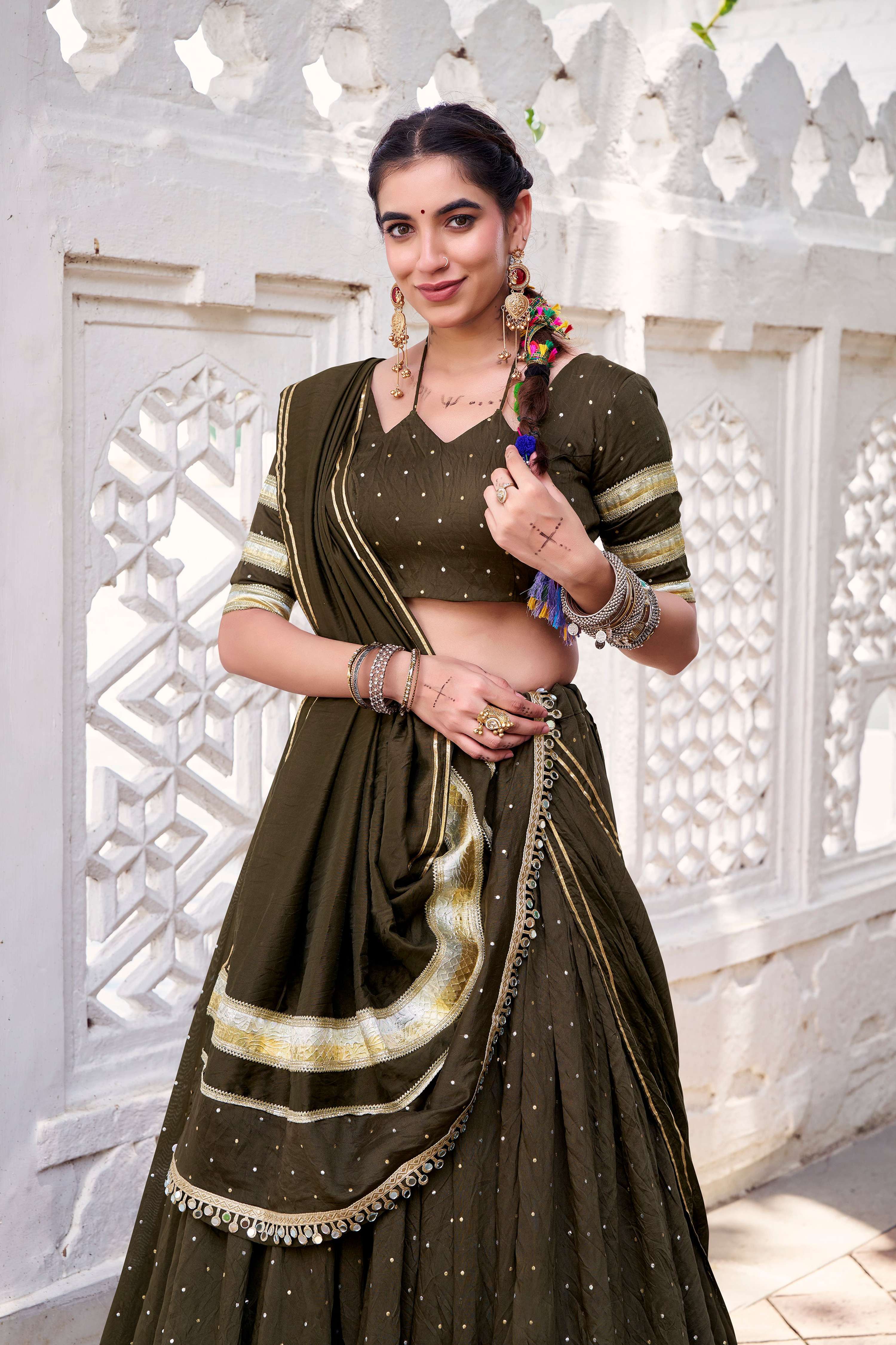 Lorenvalley Fashion Mahendi Pure Chanderi Zari Weaving Work With Embossed Design Lace Touch Up Lehenga Choli with DupattaAbout the product:Navratri...