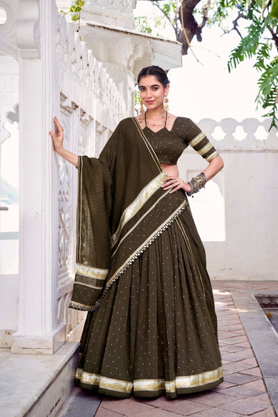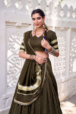 Lorenvalley Fashion Mahendi Pure Chanderi Zari Weaving Work With Embossed Design Lace Touch Up Lehenga Choli with Dupatta
