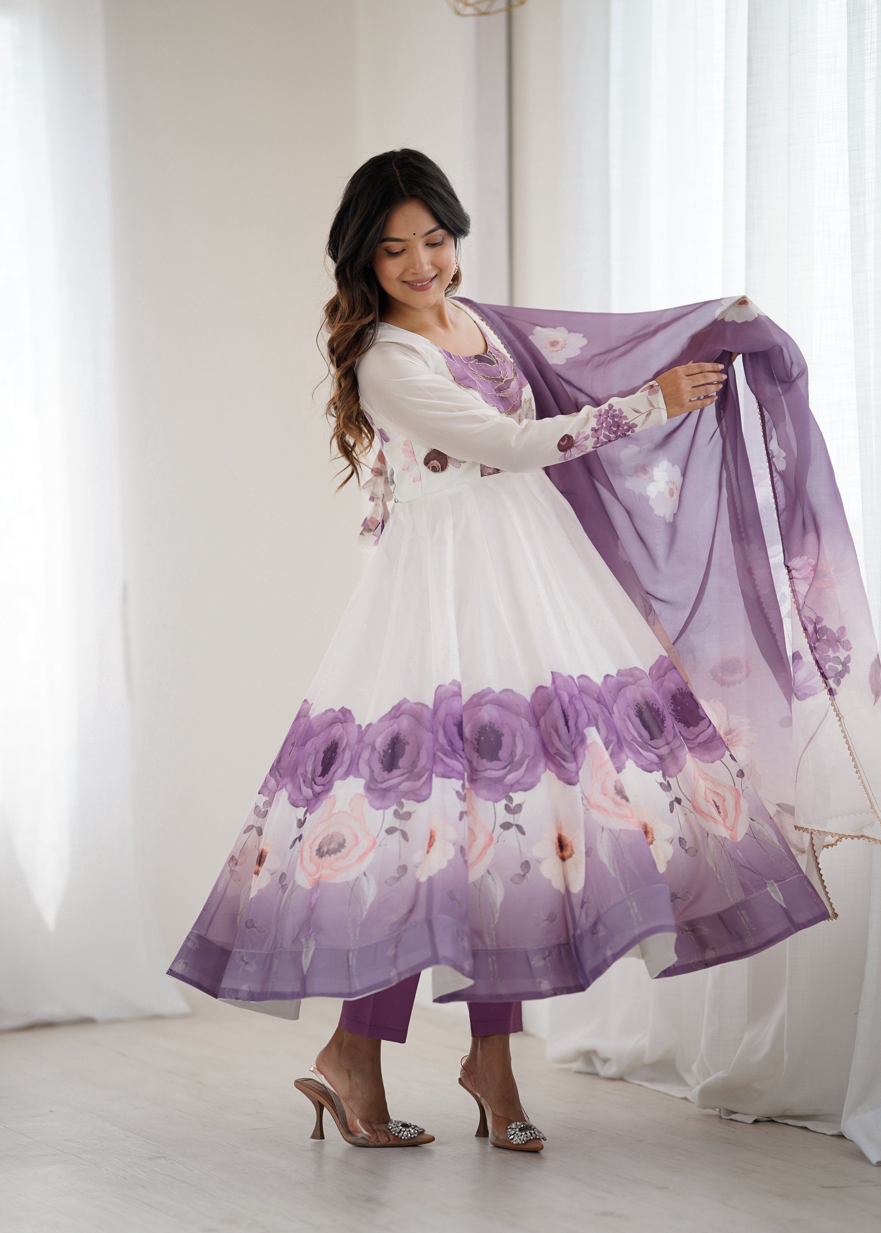 Timeless and Classic Violet Floral Printed Organza Anarkali Suit Set For The Upcoming Festivities and Wedding Season