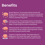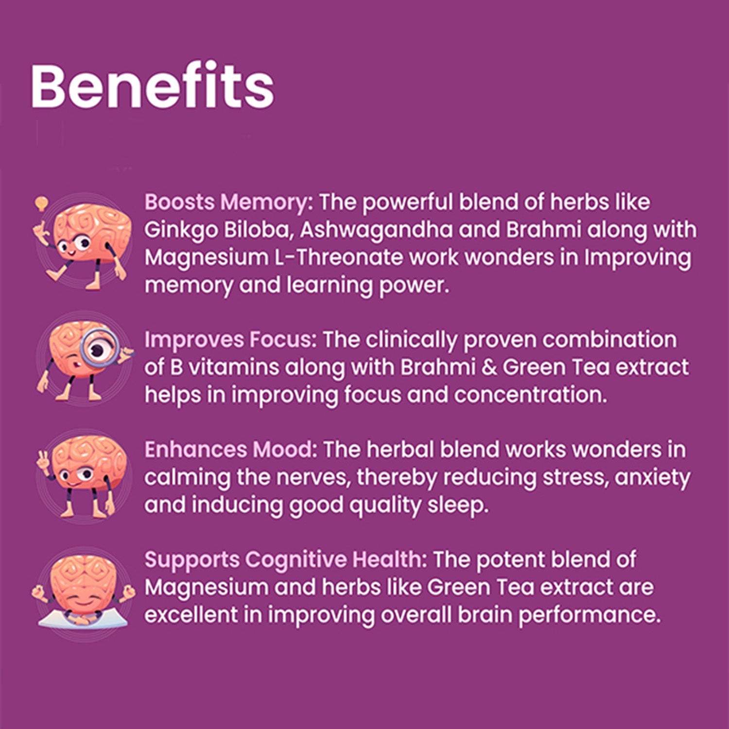 It has powerful blend of herbs like Ginkgo Biloba, Ashwagandha, Brahmi and, Green Tea along with Magnesium Aspartate. Herbs like Ginkgo Biloba helps in improving thinking, learning & memory. Ashwagandha helps to enhance the function of the brain and nervous system, and also helps to improve the memory. Brahmi helps in reducing the symptoms of anxiety & mental fatigue, & helps in increasing the memory span. Green tea helps in nerve growth, & has antidepressant properties as well. Magnesium Aspartate is important for brain health & supports healthy sleep, a calm mood, and relaxed muscles, and nerves. The entire blend helps in calming the nerves, thereby reduces stress, anxiety & induces a good quality of sleep.