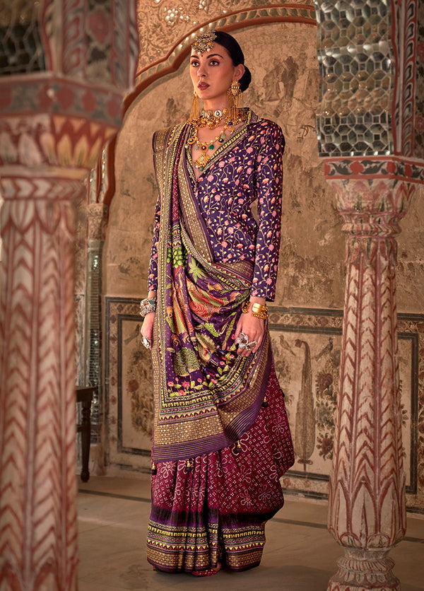 Monjolika Fashion Presents Be an angel and create and establish a smashing impression on anyone by wearing this maroon colour viscose silk designer traditional saree. This enticing attire is showing some remarkable rajwadi print with dew drop work. Comes with unstiched blouse. (Slight variation in color, fabric & work is possible. Model images are only representative.)