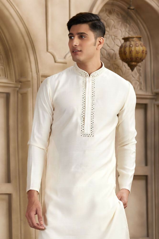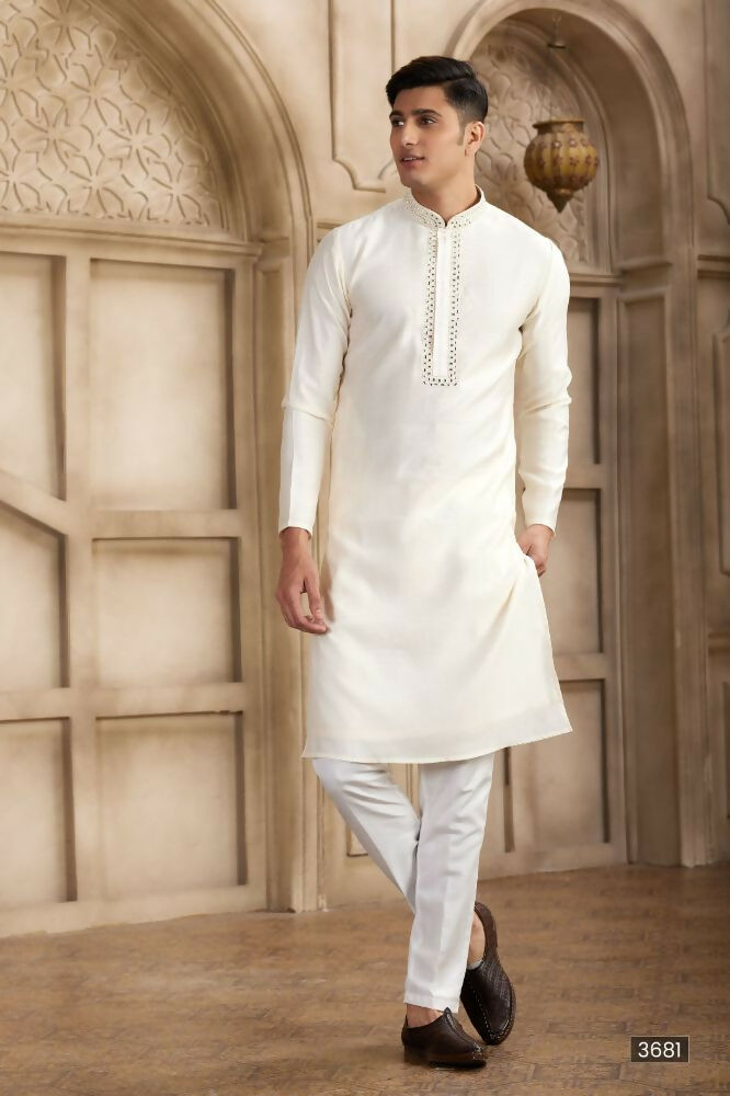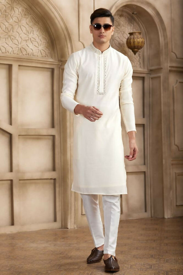 Raivat Ethnic Banarasi Art Silk Mirror Work Kurta Pajama In Cream ColourAbout the product:Enhance your traditional wardrobe with this stylish kurta...