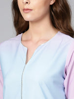 • Blue and purple-dyed straight calf length kurta, has a round neck, short sleeves, side slits