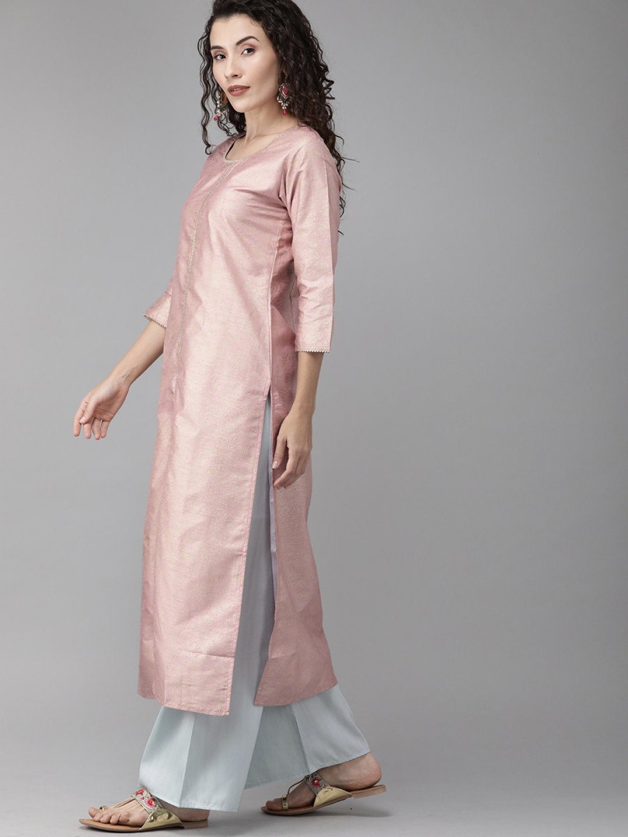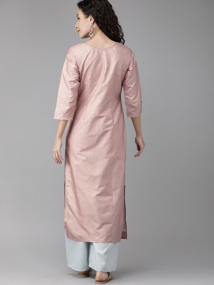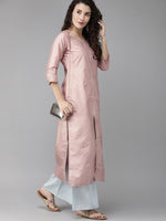 • Pink straight calf length kurta, has a round neck, three-quarter sleeves, straight hem, multiple slits