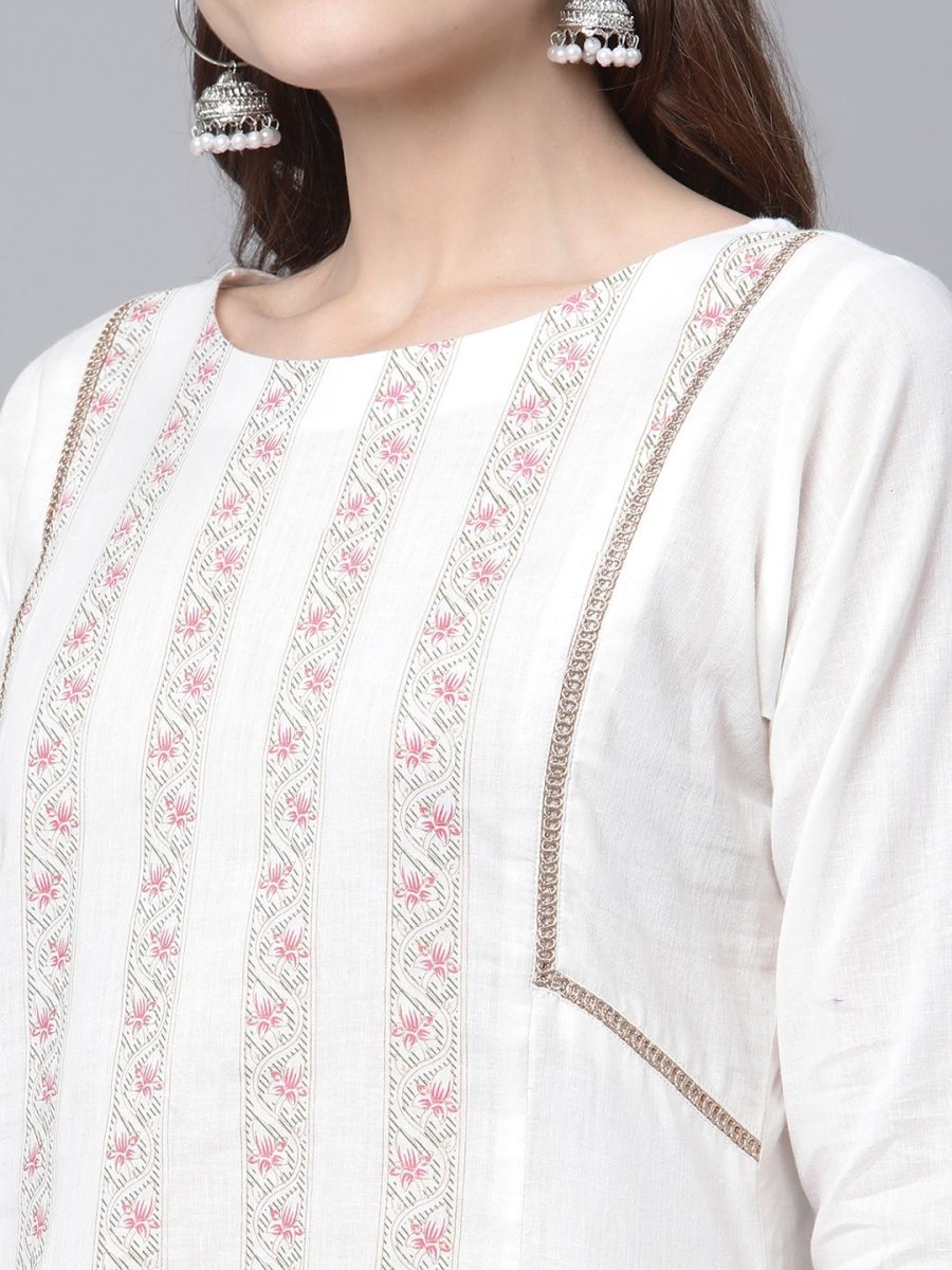 Ahalyaa Women's Off white Pure Cotton Printed Asymmetric Kurta Palazzo Set