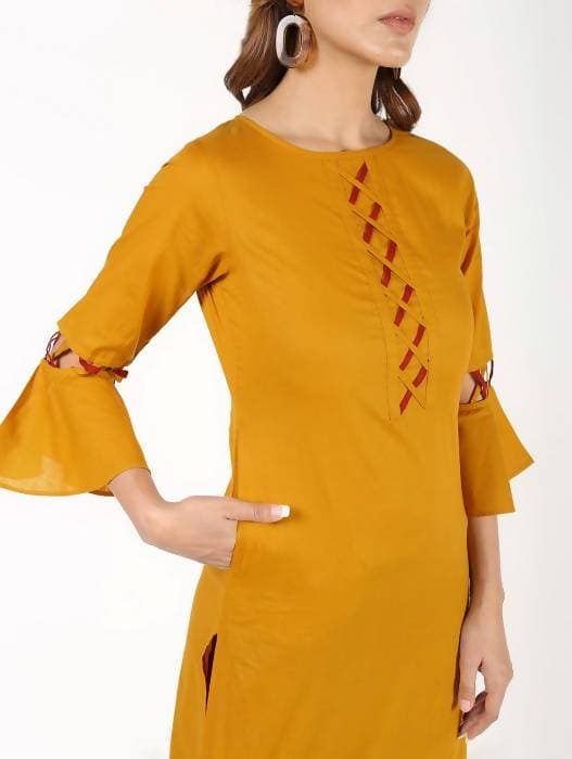 Aniyah Cotton Criss Cross Bell Sleeves Straight Mustard Color Kurta: