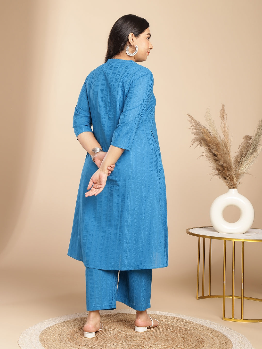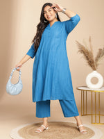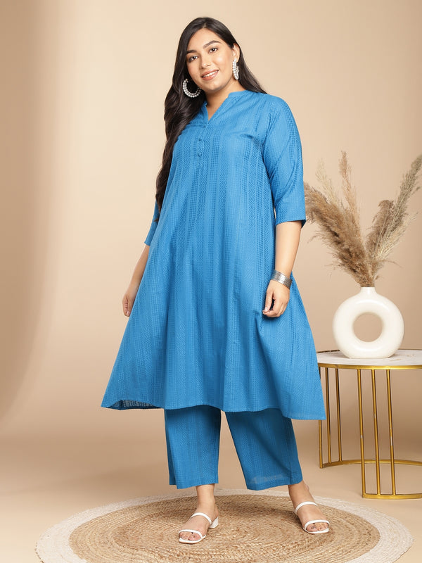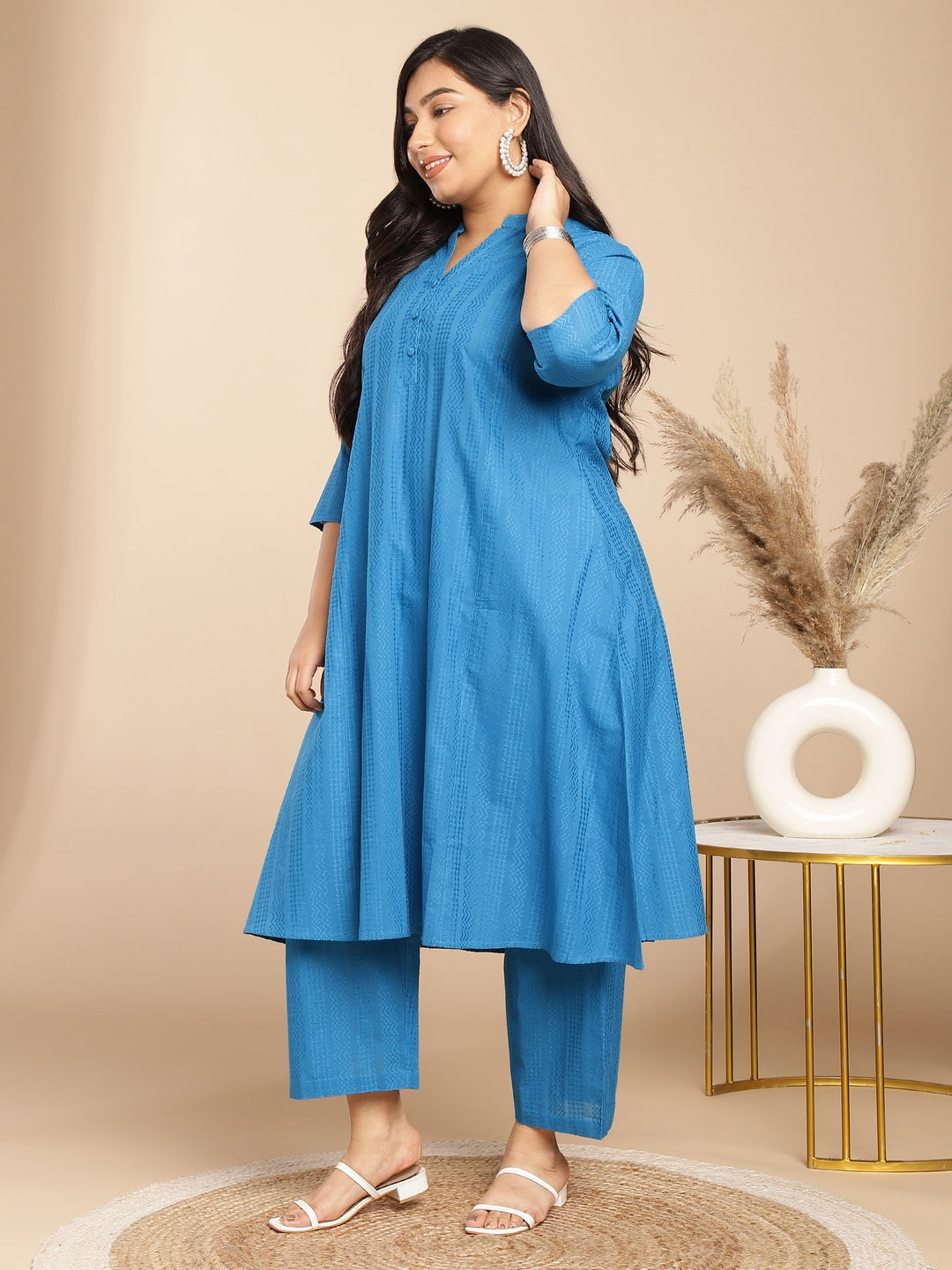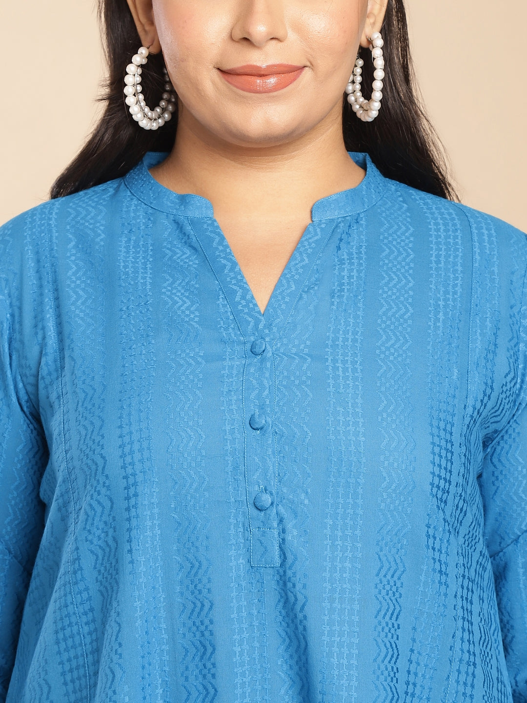 Janasya A-Line Jacquard Teal Self Design Band Collar Co-Ords - 5XL